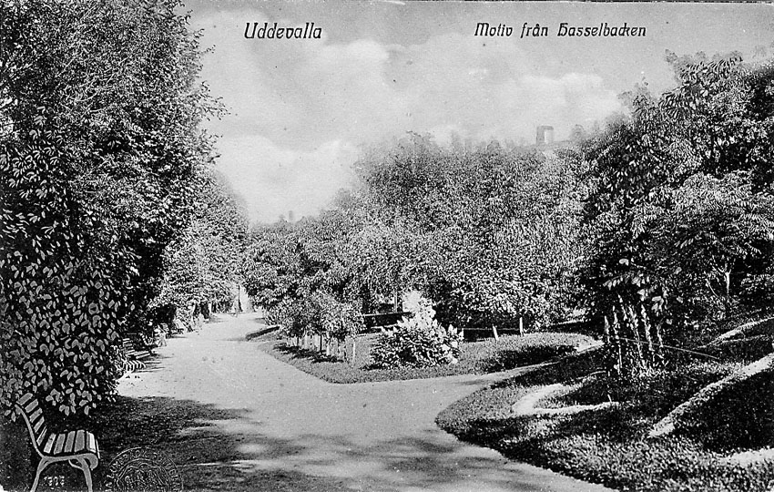 Tryckt text på vykortets framsida: "Uddevalla. Motiv från Hasselbacken".