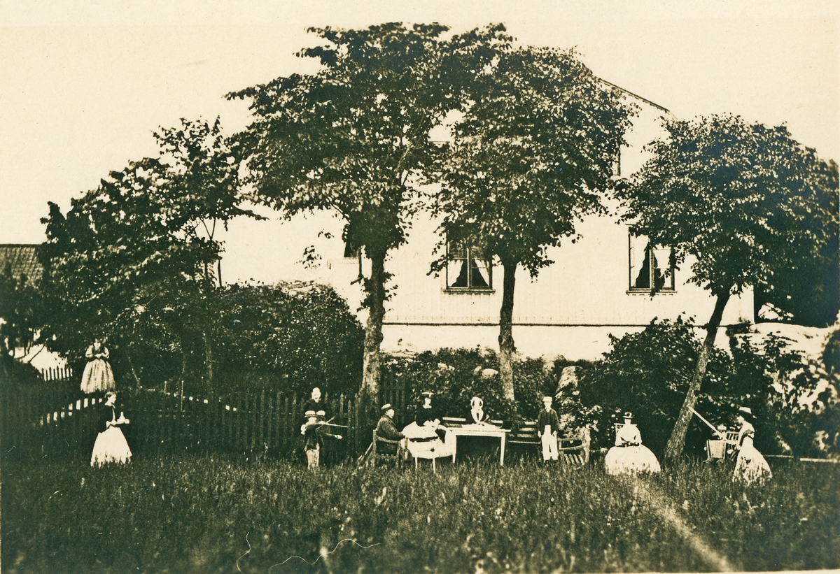 Gruppfoto i en trädgård med ett bostadshus bakom.