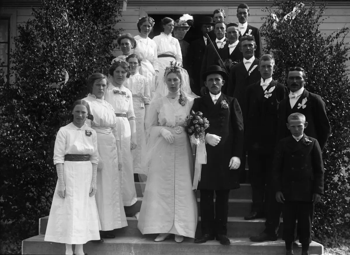 Bild 498. Bräudparä me bruttbondä, spelman, tärnår och marskalkar pa Andasä bryllaupä