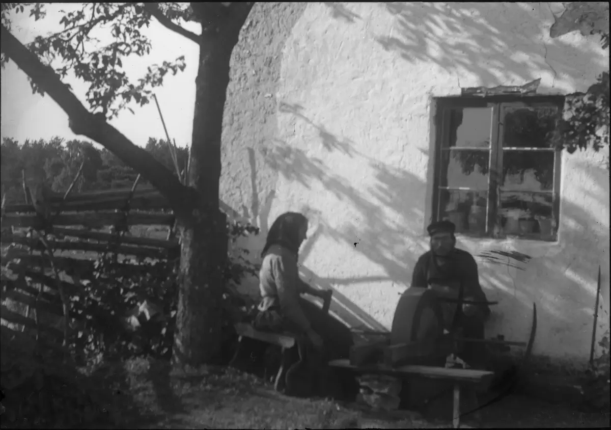 Bild 85. Jakob Karlsson vässar sigdn u gamblä-mor drägar vaivi