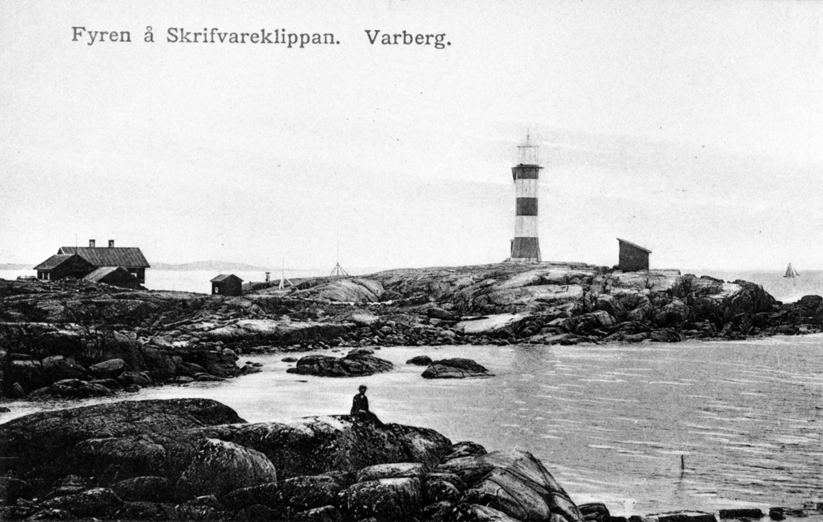 Vykort, "Fyren å Skrifvareklippan. Varberg. Bilden visar även fyrbostad med uthus och i förgrunden sitter en man på klippan. Fototid ca 1900.