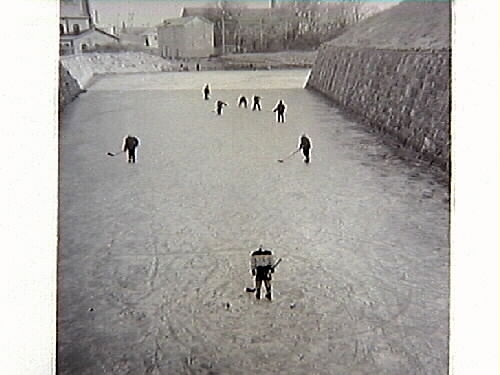 Skridskoåkning och ishockeyspel på vallgravens is i Varberg.