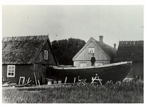 Uppgifter till bilden: "Skeppsbyggeri. Båtbyggare Severin Nilsson, 'Lell Nailsa Severin' eller 'Stranningen'. Åren 1890-1905 lär han ha byggt alla båtar i Glommen, Lynga och Träslövläge."