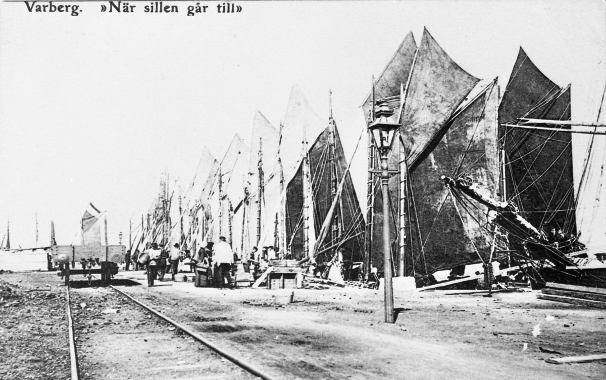 Fiskebåtar lossar sillfångst i Varbergs hamn. Ca 1900.