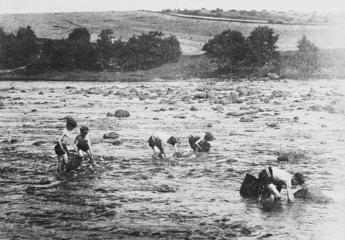 "Skånsapågarna" som pärlfiskare år 1910 eller 1911. Vid lågvatten i Lagan kunde småpojkarna gå här vid "Drottningvadet" (efter drottning Margareta) i Laholm och plocka flodpärlmusslor med händerna. Musslorna blev allt färre sedan kraftverket anlagts 1932 och 1961 förbjöds pärlfisket i Lagan. Sedan 1994 är flodpärlmusslan fridlyst i hela Sverige.