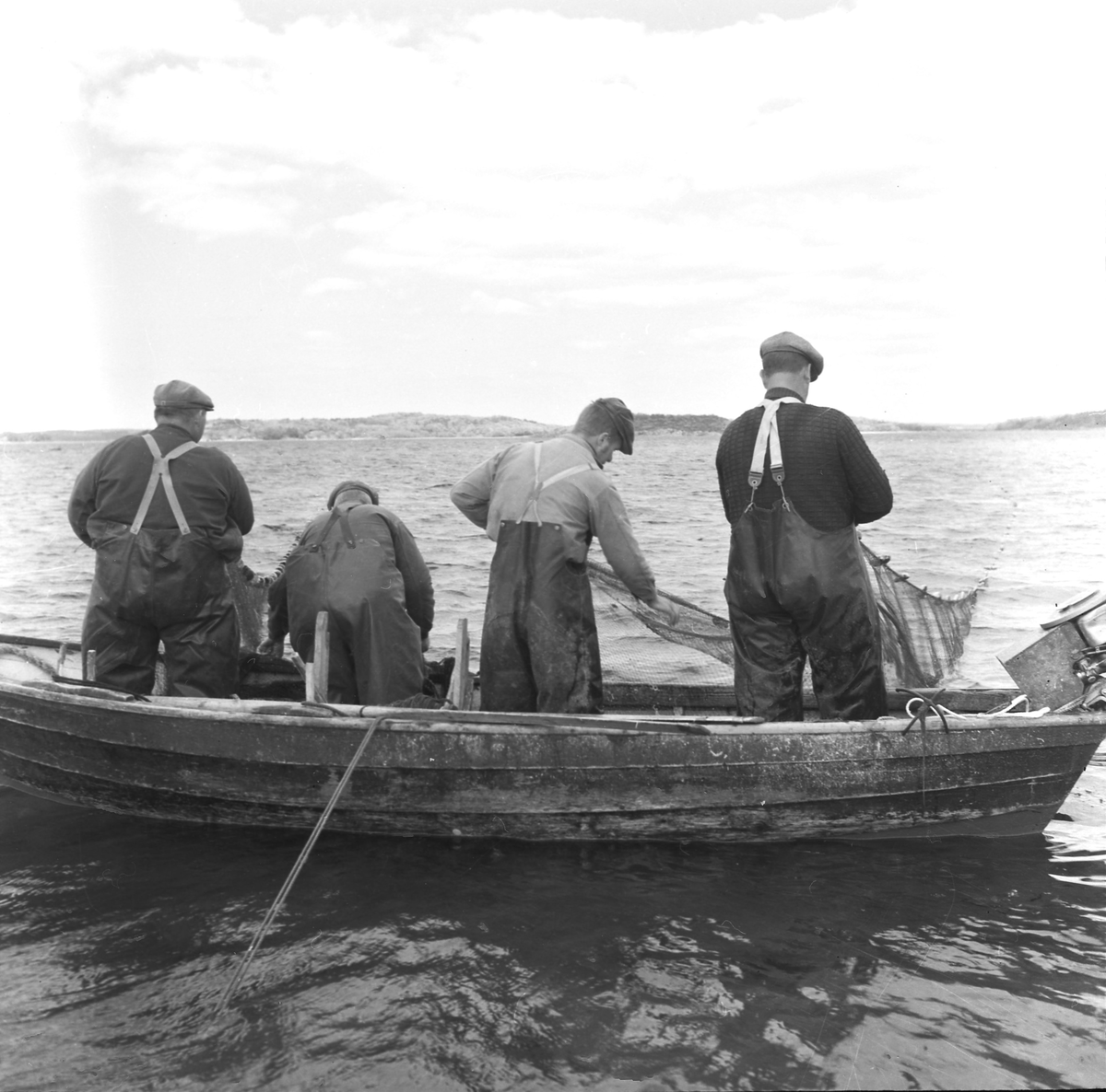 Fiskelag från Ölmanäs med fyra män som fiskar horngädda med vad.