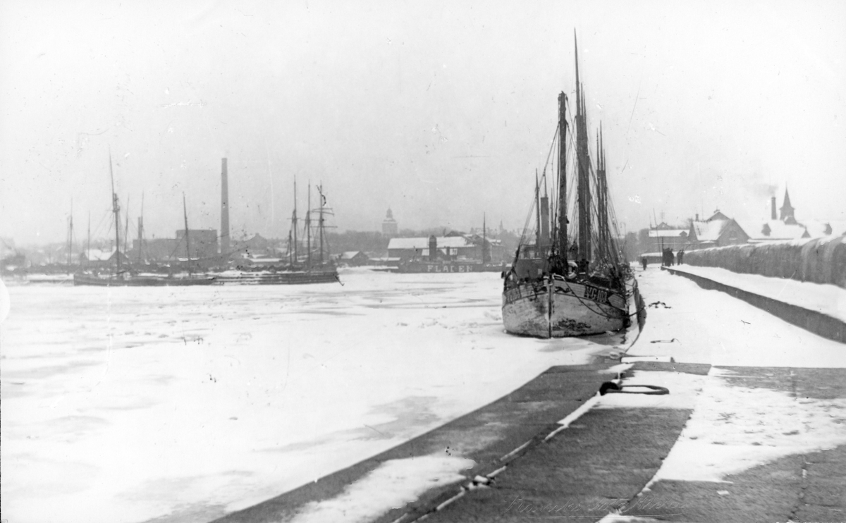 Vykort med motiv från den igenfrusna hamnen, Varberg. I bakgrunden ligger fyrskeppet Fladen och till höger ses tullhus och varmbadhus.