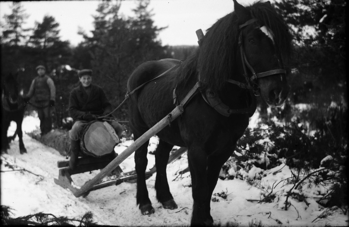 Häst i förgrunden som drar timmer i skogen en vinterdag. På stocken sitter en yngling och i bakgrunden skymtar ytterligare en man med häst.