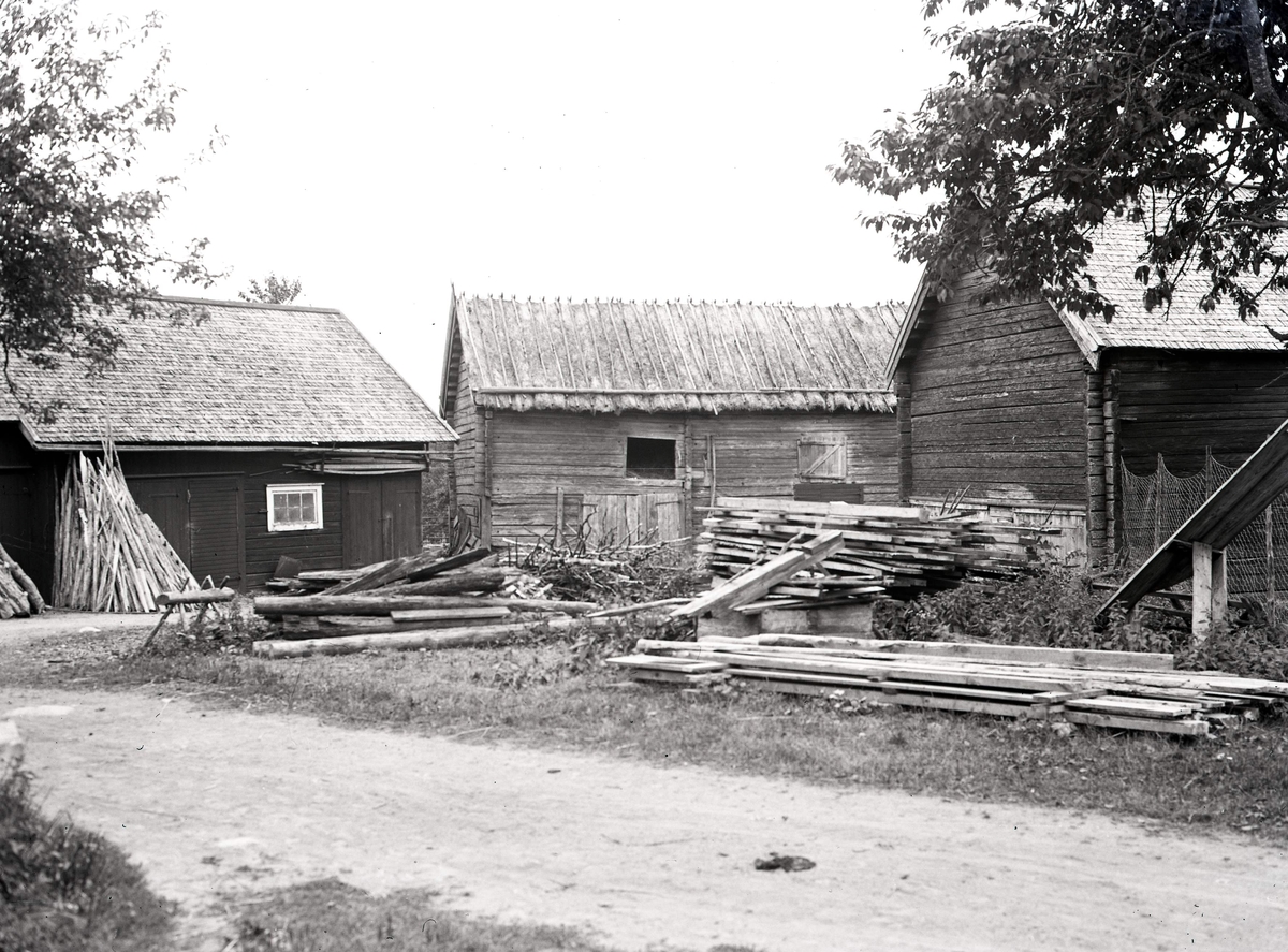 Bearbetat timmer och uthus med spåntak och stråtak. Två av uthusen har korsknutar.