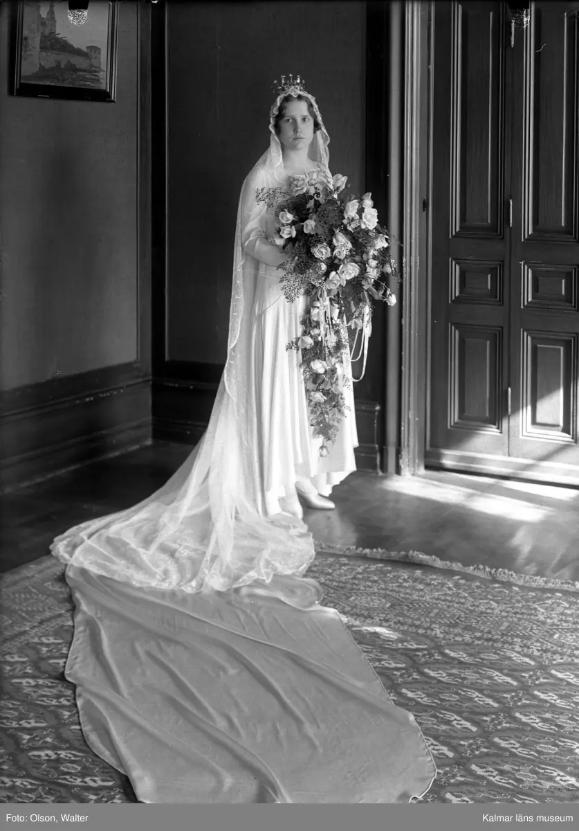 Bröllopsfoto av en kvinna. Enligt Walter Olsons journal är bilden beställd av godsägare Henrik Nordenskjöld ifrån Fårbo i Oskarshamn.