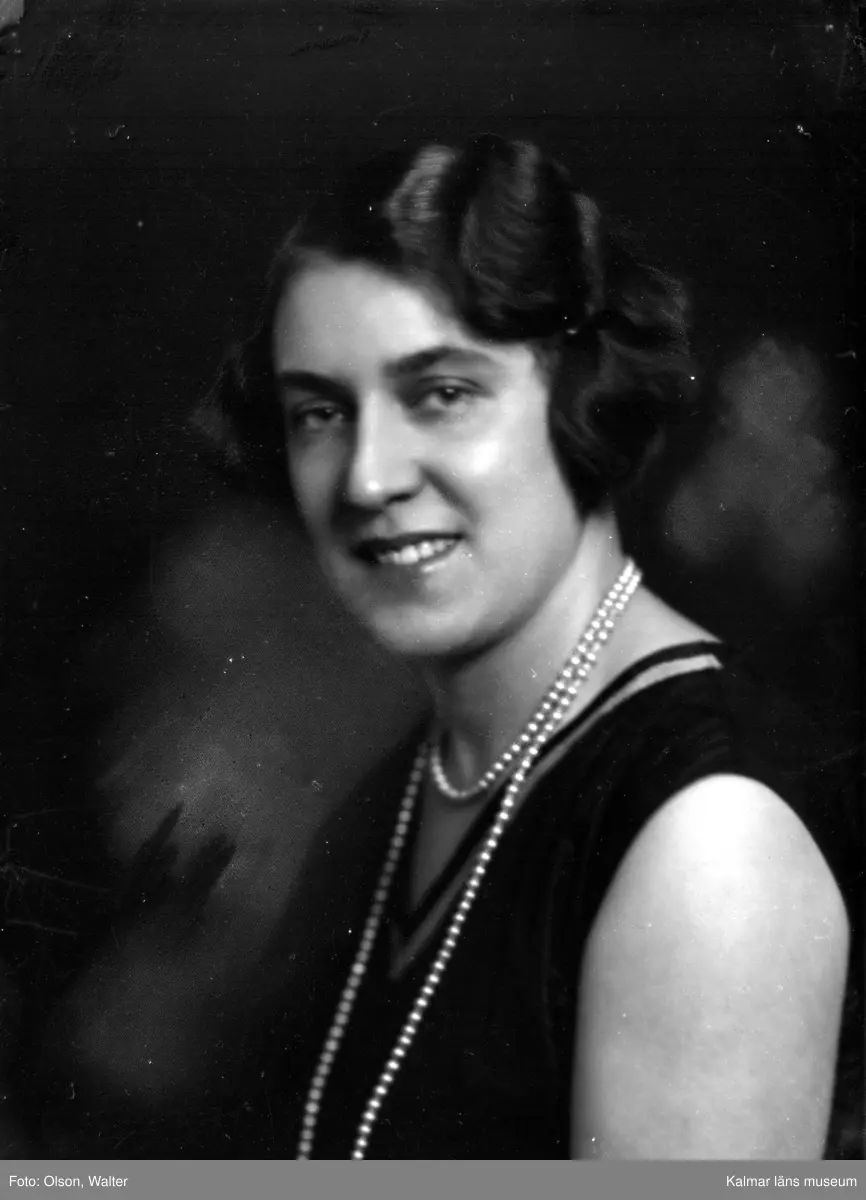 Ateljébild på en kvinna i pärlhalsband. Enligt Walter Olsons journal är bilden beställd av fröken Elin Johnsson ifrån Bremergatan 9 i Kalmar.