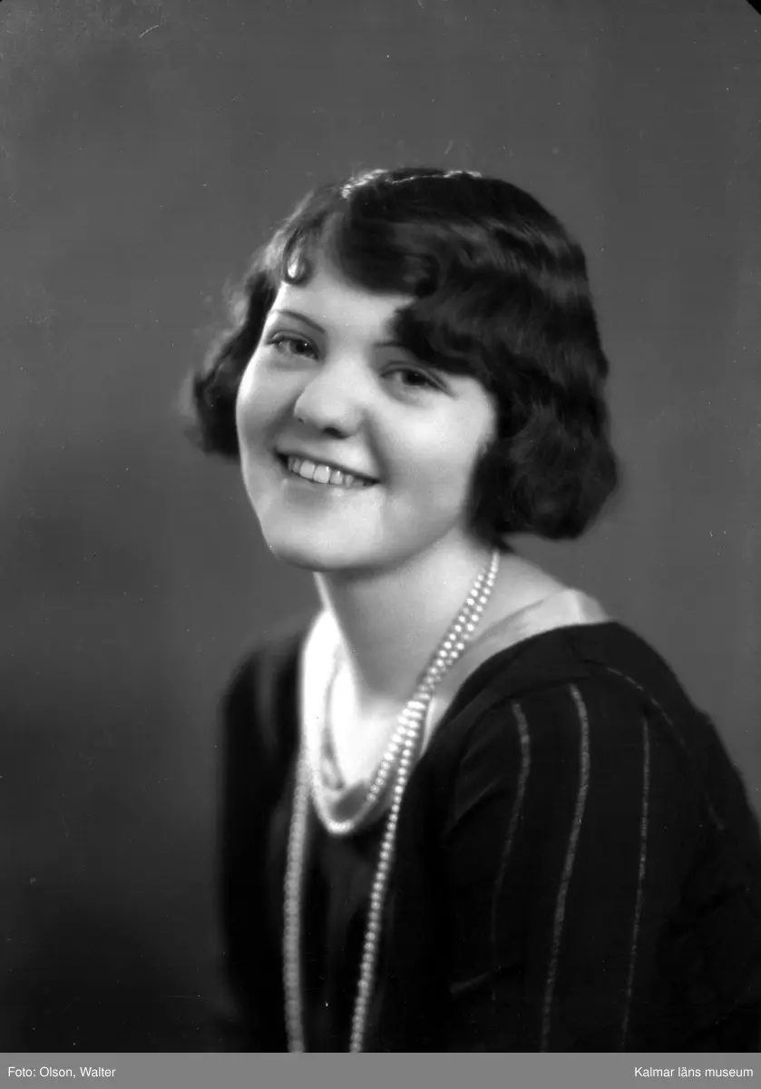 Ateljébild på en kvinna i klänning och halsband. Enligt Walter Olsons journal är bilden beställd av Rut Svensson ifrån Sparregatan 1.