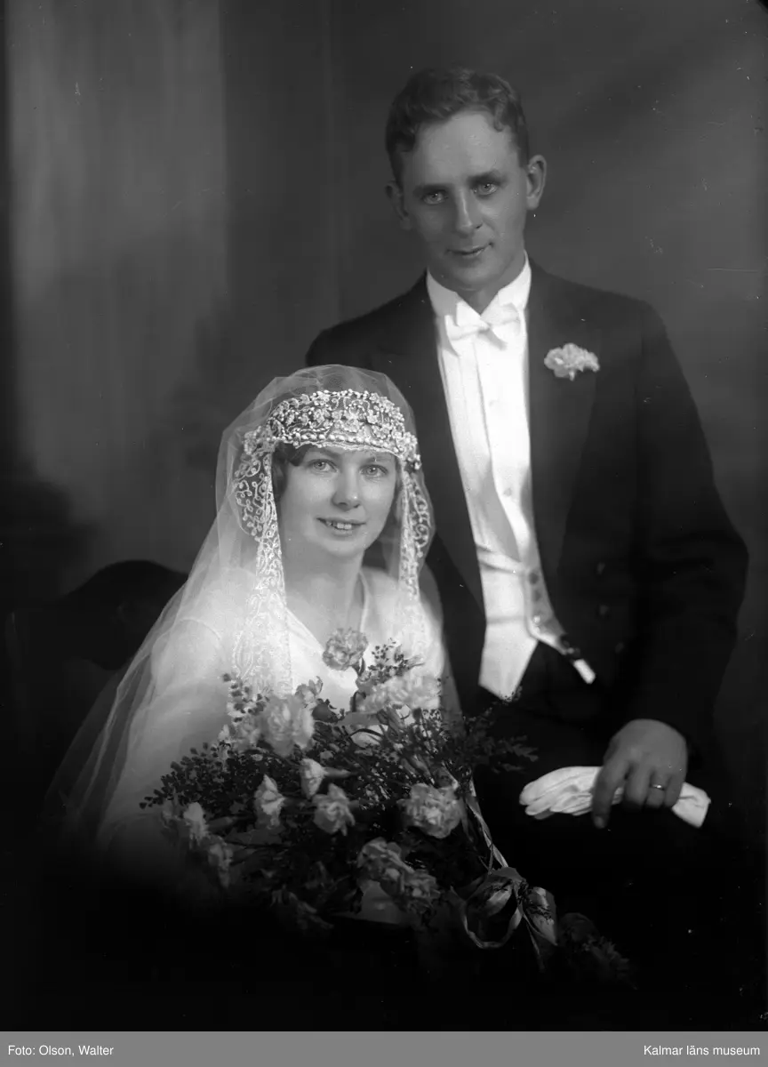 Bröllopsfoto av ett par. Kvinnan har en slöja och håller i en blombukett. Enligt Walter Olsons journal är bilden beställd av kapten A E Lundberg ifrån Svanebäcksgatan 19 i Göteborg.