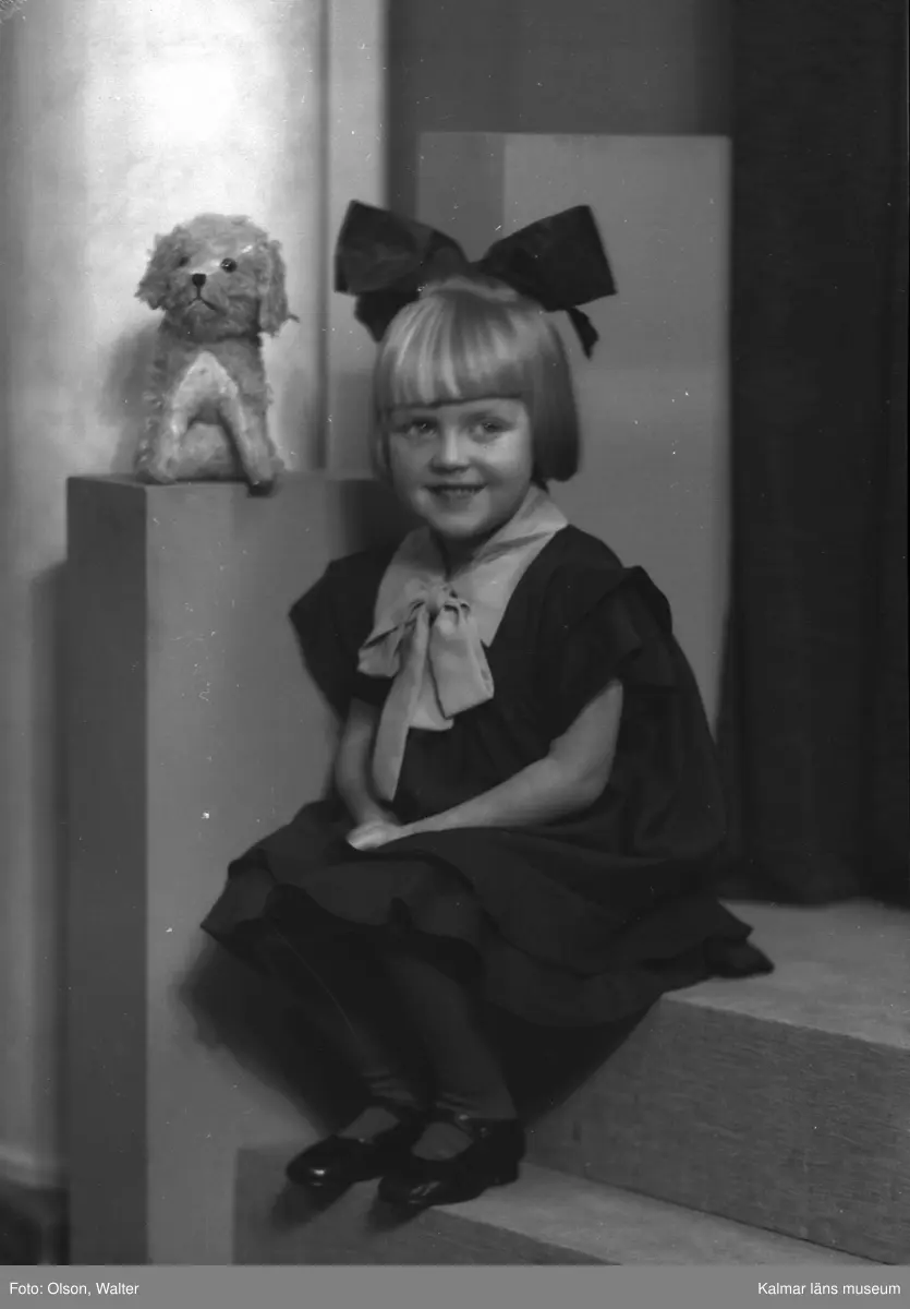 Ateljéfoto. Liten flicka med leksakshund.