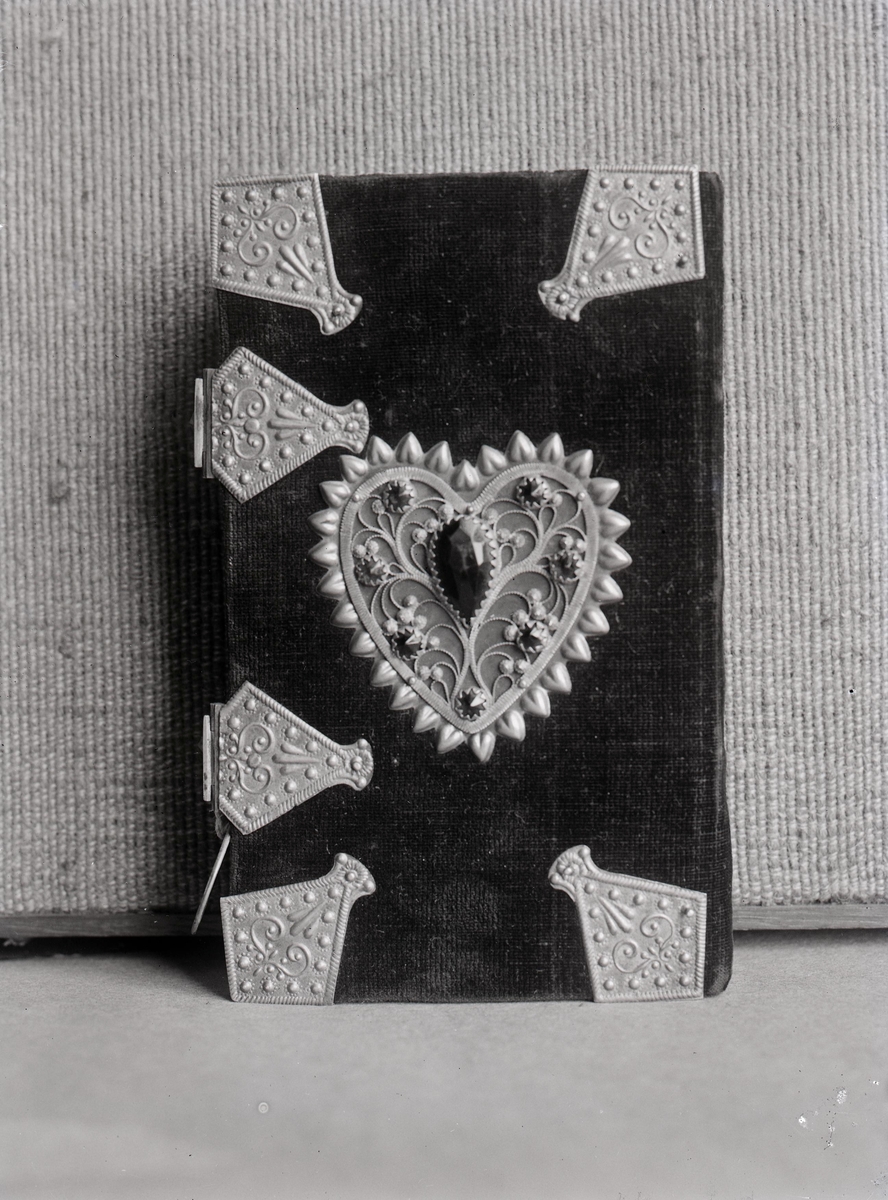 Ett tygklätt album med metallbeslag och filgrandekor med stenar.