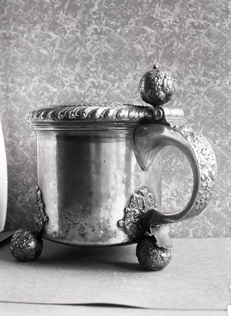 En silversejdel med kulfötter och lock.