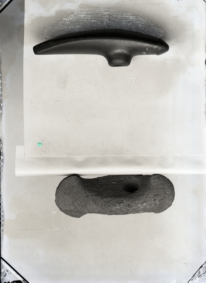 Två skafthålsyxor i sten.