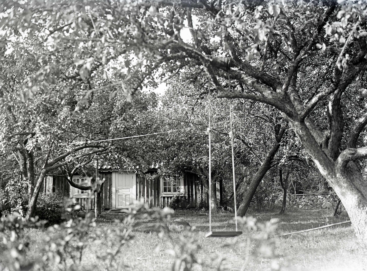 En gunga upphängd i ett träd framför en stuga.