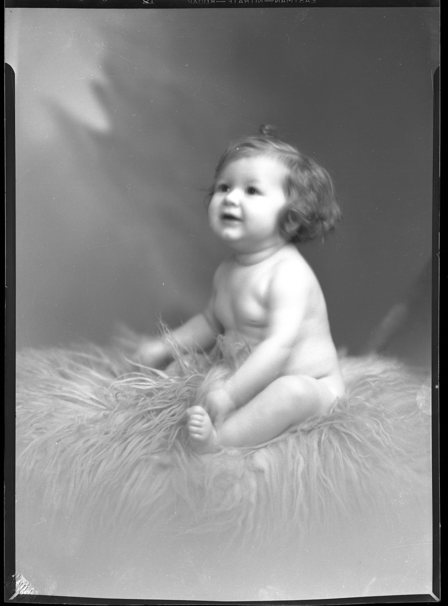 Ateljéfoto. Baby sittande på fårskinnsfäll.