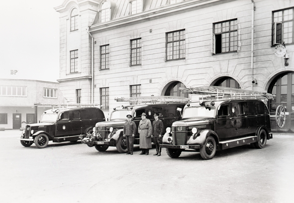 Tre brandbilar uppställda utanför Brandstationen tillsammans med från vänster Abbe Florin, Jansson och Einar Molander.