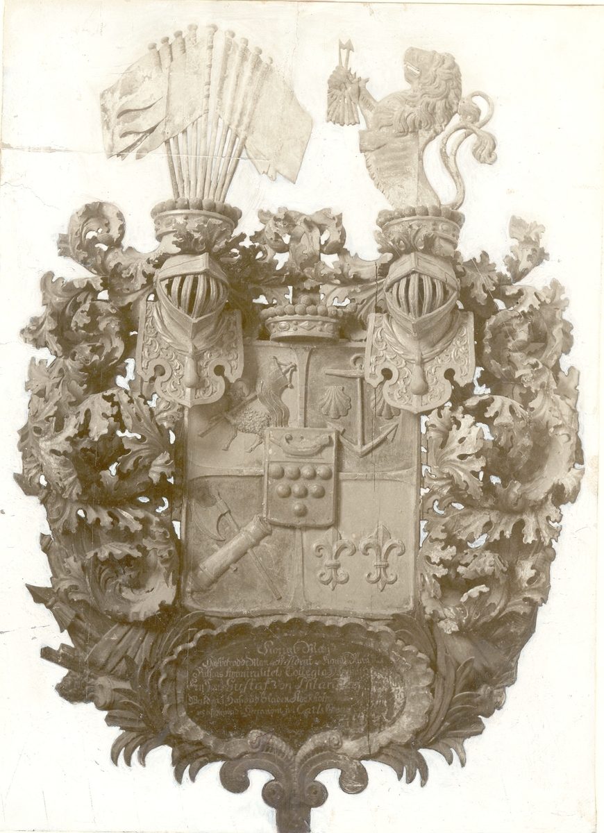 Begravningsvapen i Kalmar domkyrka. Friherre Gustaf von Psilander, 1669-1738. Landshövding över Kalmar län 1728-34. President i Amiralitetskollegiet. Förde befälet å konvojskeppet "Öland" under dess strid mot en engelsk eskader 1704. Foto före konserveringen.