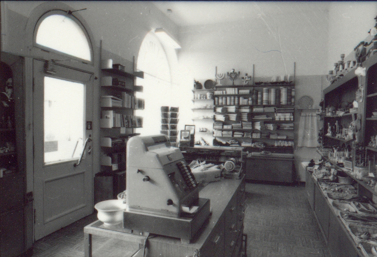 Museibutiken Calmus, kassadisk och butikshyllor med varor.