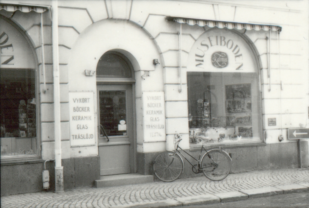 Teaterbutiken Calmus, entrédörr och skyltfönster.