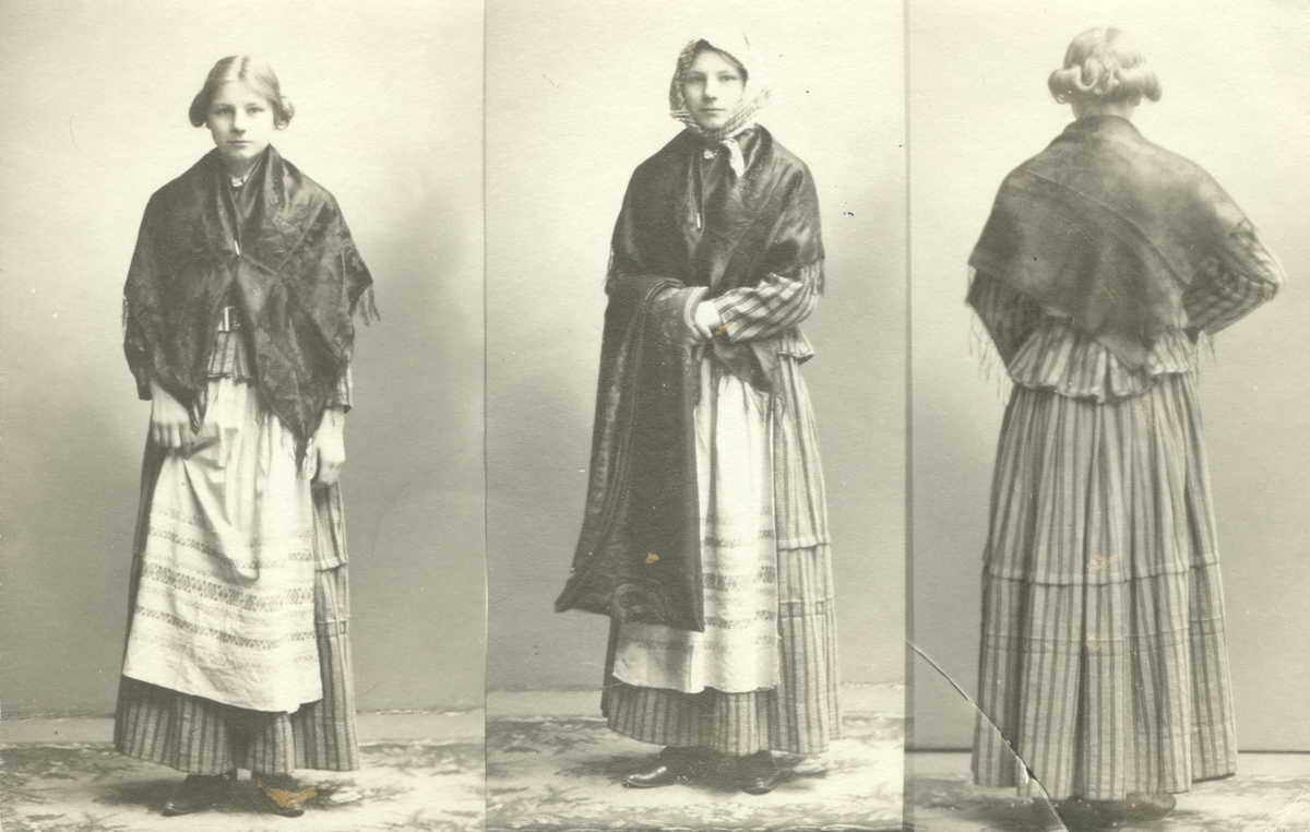 Tre bilder på flicka utklädd till bondkvinna.