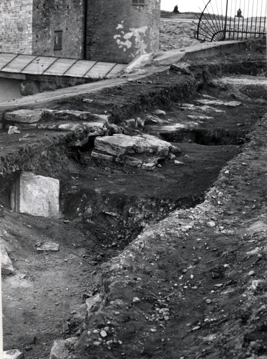 Utgrävning på Kalmar slott. Östra schaktet sett mot söder. Obs den profilerade kalkstenen till vänster i schaktgränsen. Rapporten: Krutkammaren, vallgraven, västra vallen och brunnar.