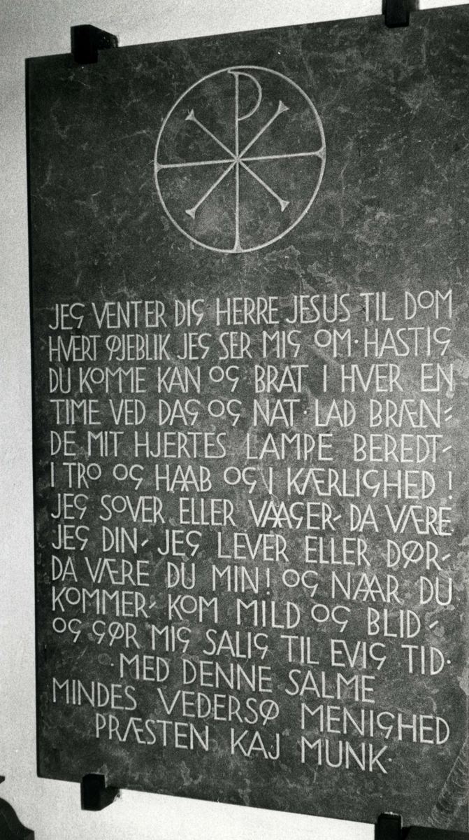 Minnessten över Kaj Munck han var bl a sogneprest i Vedersö, på Jyllands västkust, där han stannade till sin död. Präst och författare från Danmark. (1898-1944). Han blev mördad av tyskarna den 5/1 1944.