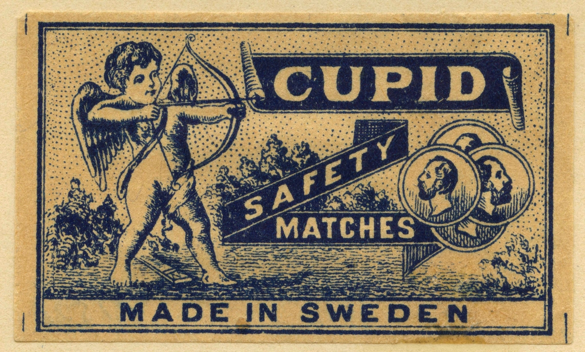 Svensk tändsticksetikett, "Cupid Safety Matches", från Samlarförbundet Skandia, vinst vid utlottning 1945.