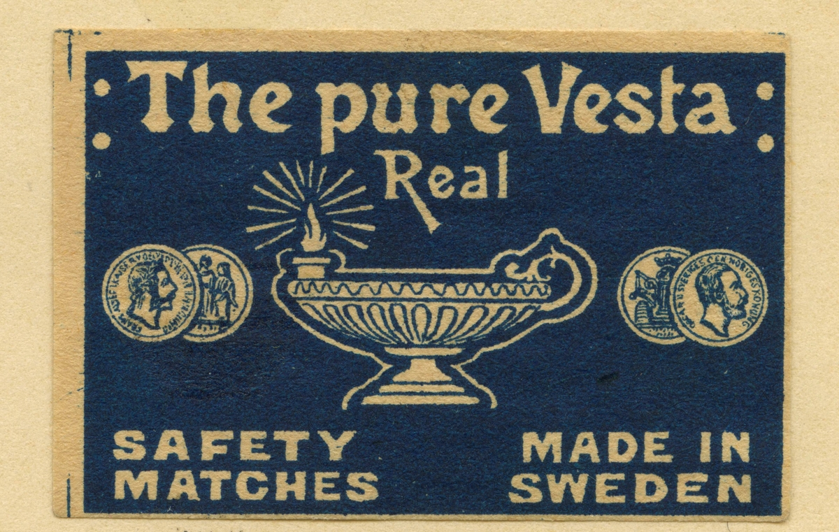 Svensk tändsticksetikett, "The pure Vesta Real Safety Matches", från Samlarförbundet Skandia, vinst vid utlottning 1945.