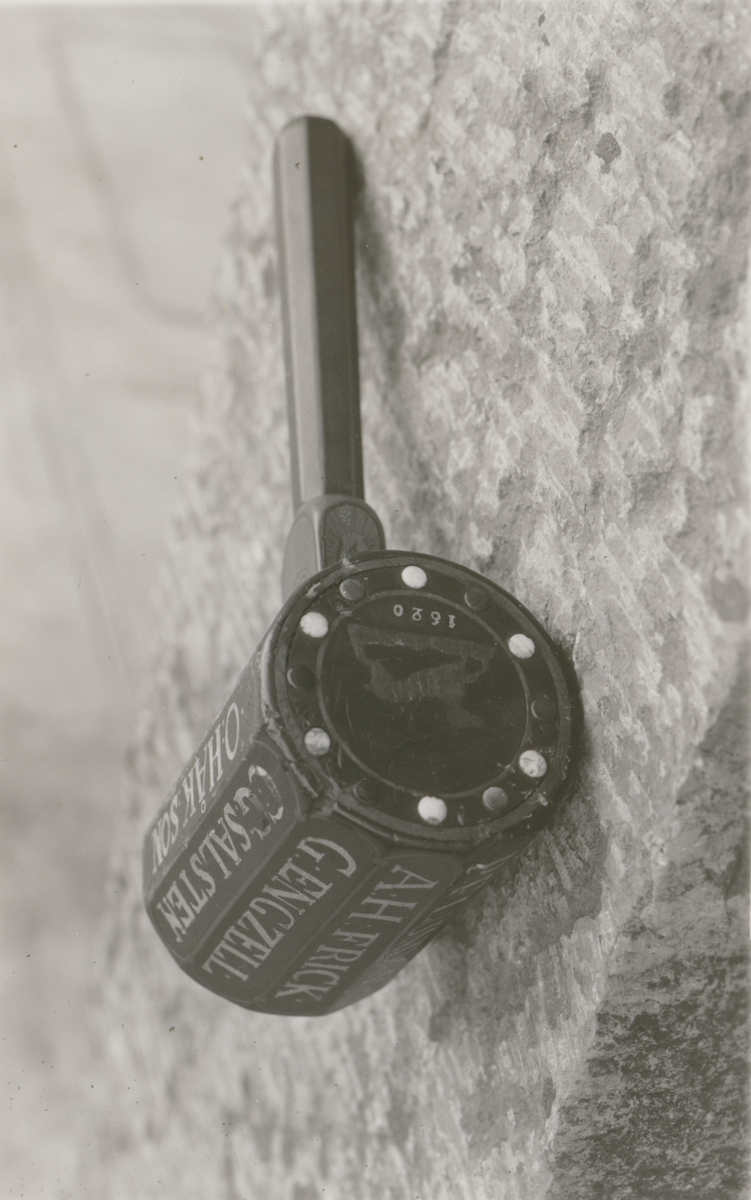 Klubba av valnöt, 12 kantig, hög, plana slagsidor. Skaft först 4 kantigt, därefter 8 kantigt.