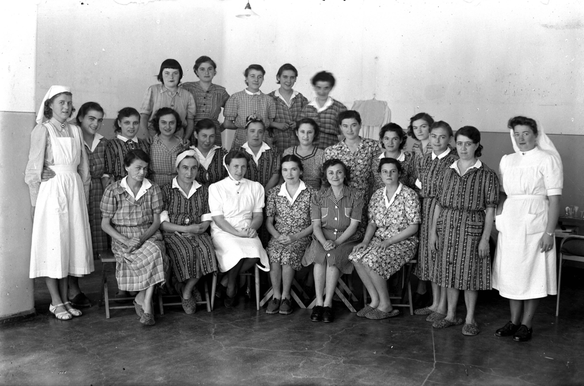 Kvinnliga flyktingar från Bergen-Belsen samman med personal på Beredskapssjukhuset i Kalmar. Bilden är troligen tagen på hösten 1945 då kvinnorna hunnit äta upp sig.