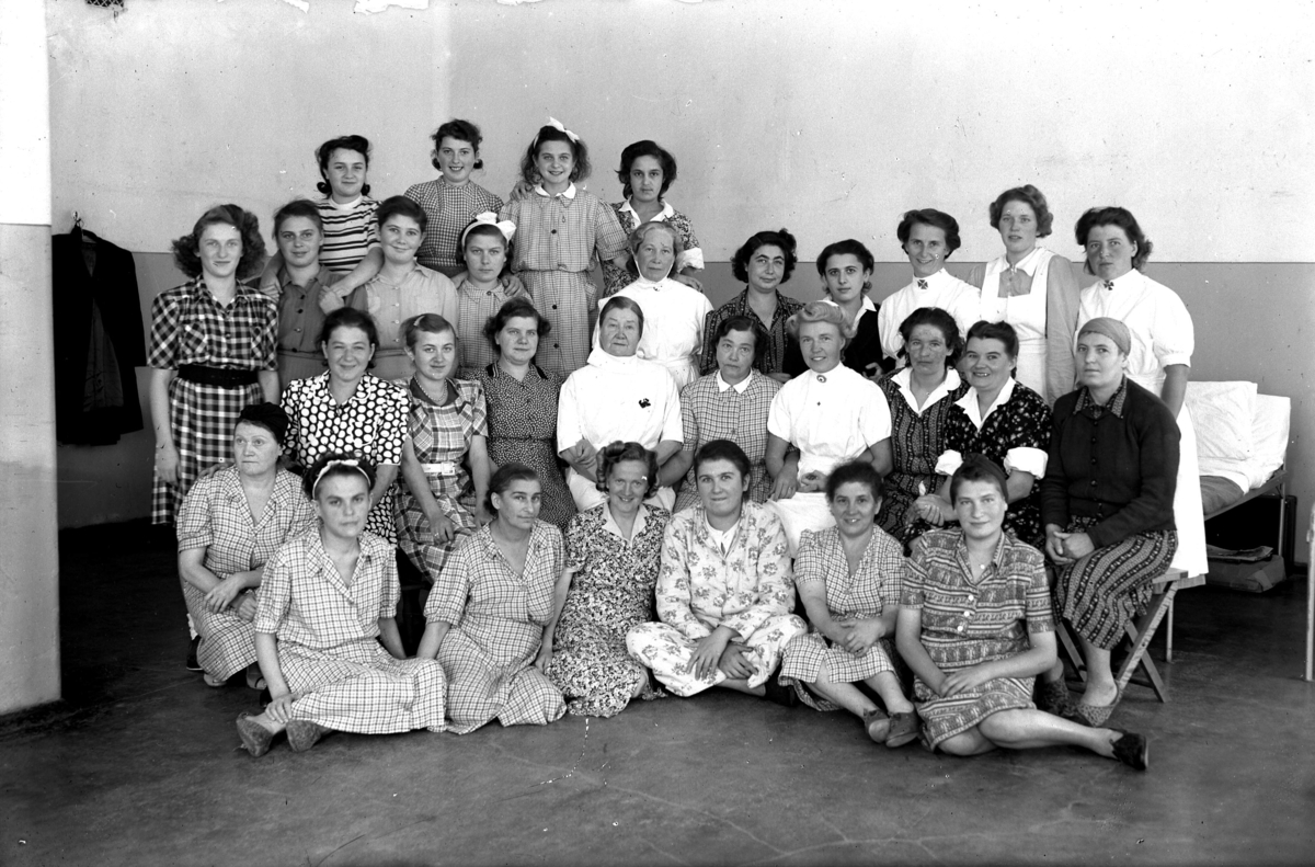 Kvinnliga flyktingar från Bergen-Belsen samman med personal på Beredskapssjukhuset i Kalmar.