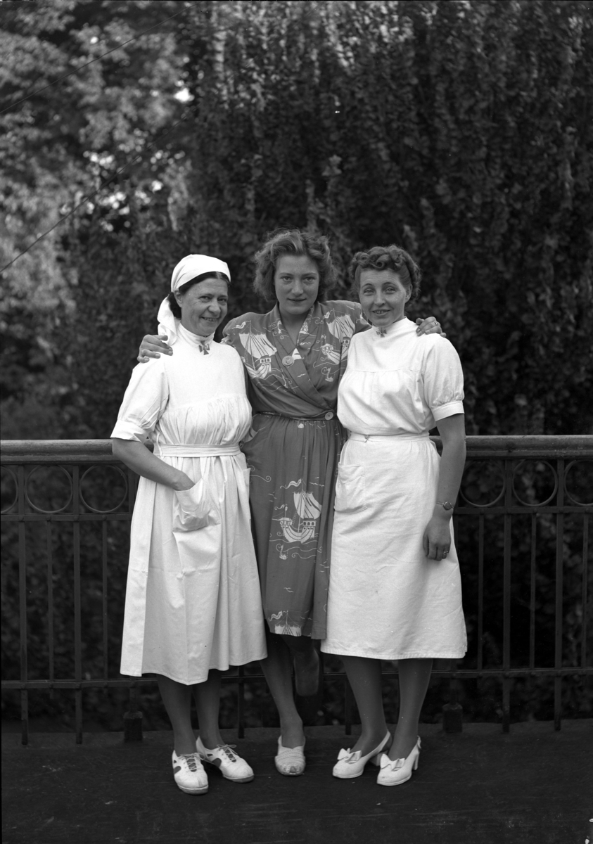 Två sköterskor och en patient på Beredskapssjukhuset på balkongen.