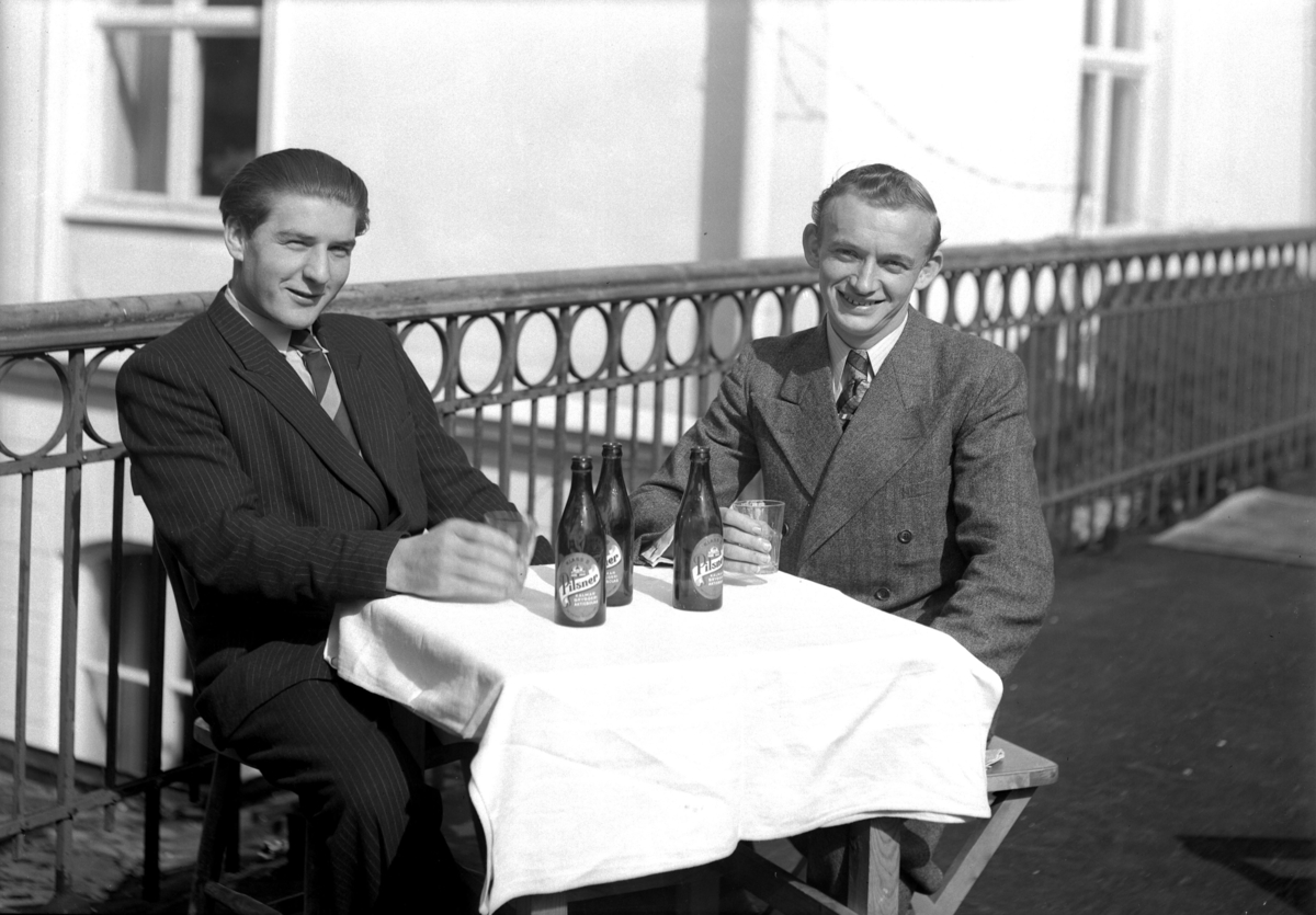 Abraham Traub till höger njuter en öl tillsammans med okänd medpatient på Beredskapssjukhusets balkong.