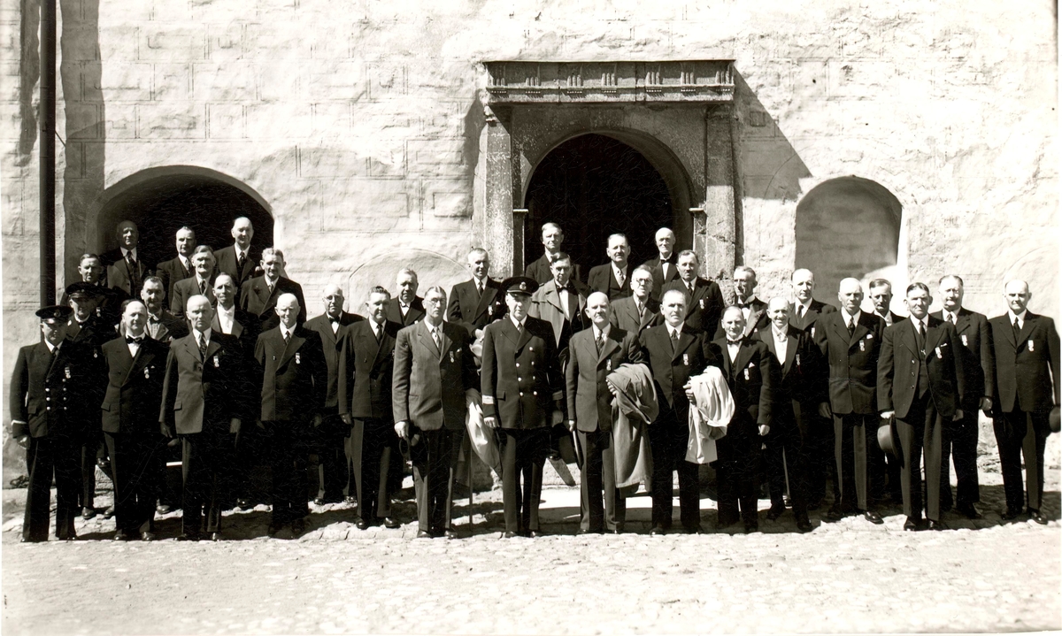 Järnvägspersonal erhåller medaljer vid en högtidlighet på Kalmar Slott 1950-talet. Bland andra lokförare Axel Johansson och banarbetare Emil Jonsson.