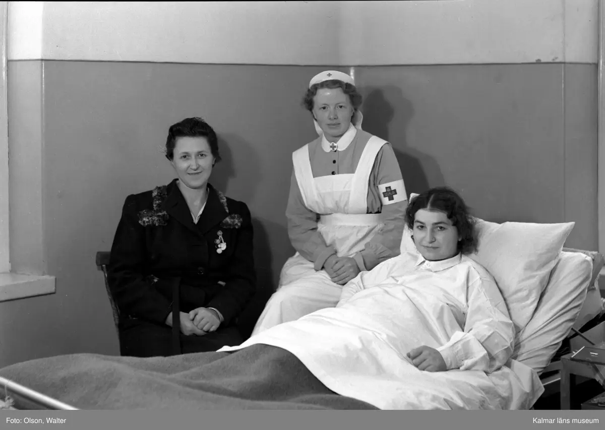 Kvinnlig sängliggande patient med besökare och sköterska på Beredskapssjukhuset.