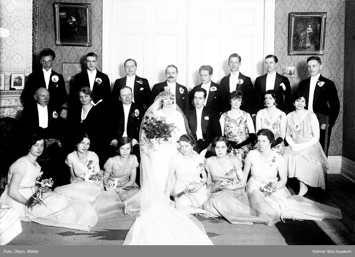 Gruppbild på brudpar med bröllopsgäster. Beställare: Hedström, Stockholm.