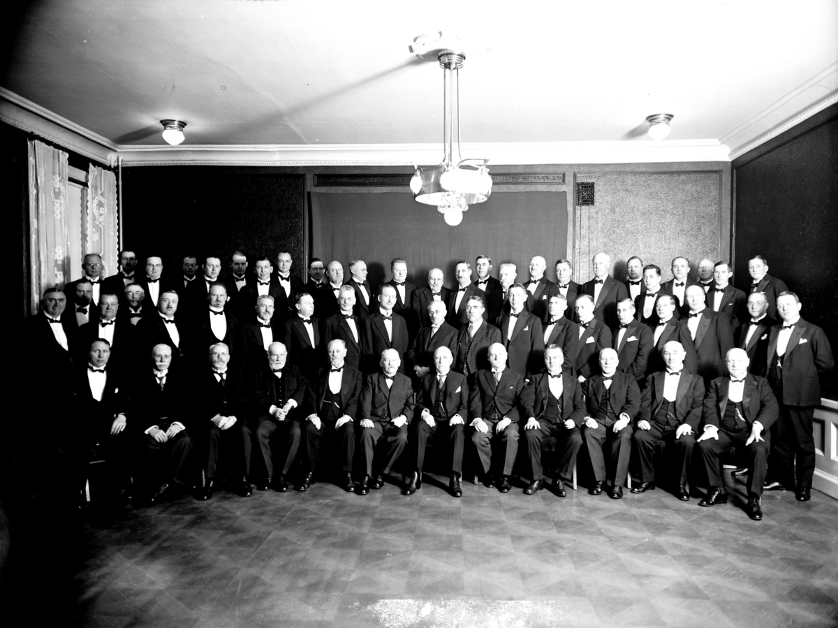 Gruppbild på män i kostym. Enligt Walter Olsons journal är bilden beställd av Industri- och köpmannaföreningen ifrån Kalmar.