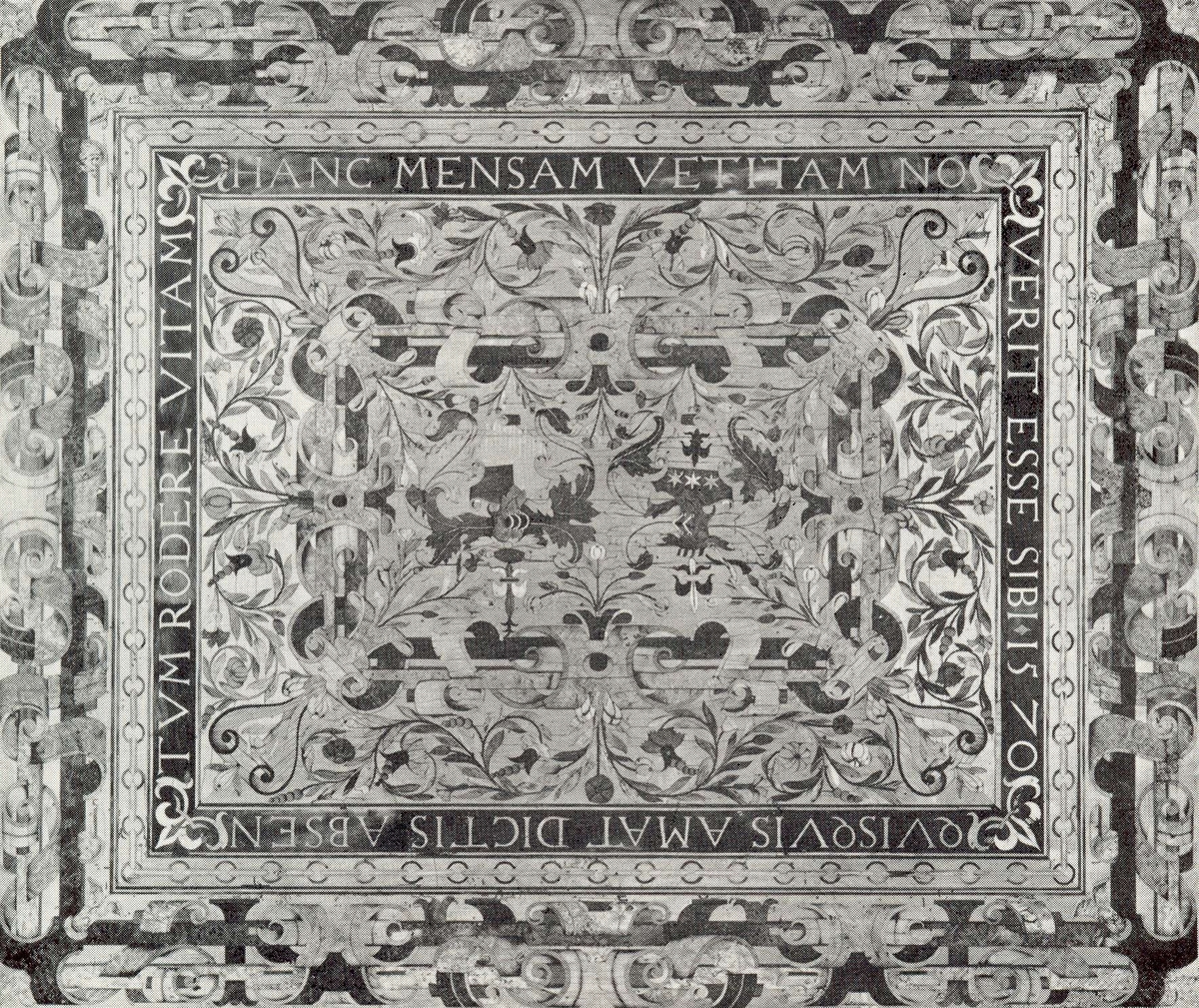 Titel: Bordskiva med intarsiadekor, daterad 1570. Schweiz. Landsmuseum, Zürich. Foto Landesmuseum. Table-top with intarsia work, dated 1570. Sweitzerland. På vissa plåtar har Martin Olsson klistrat eltejp för att markera hur bilden skulle beskäras i boken.