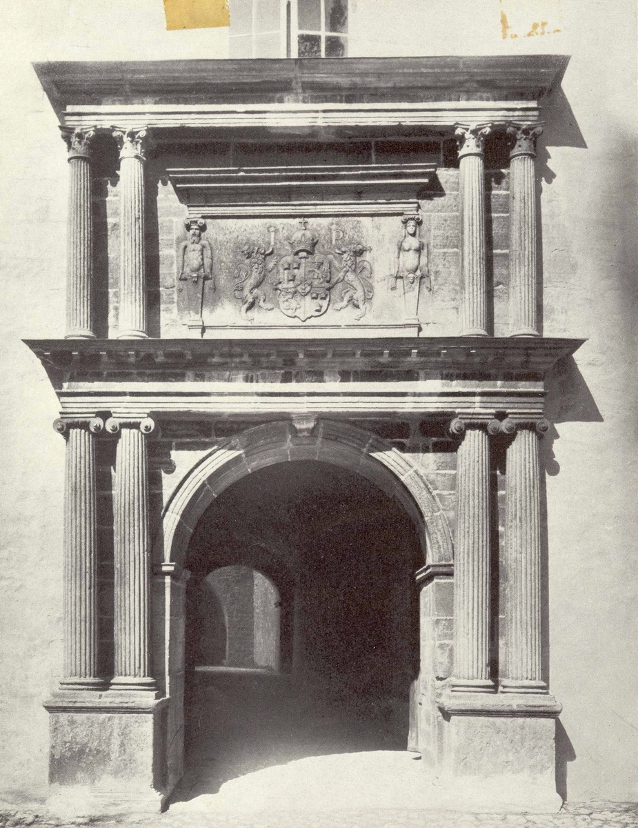 Västra borggårdsportalen, huggen i Roland Modeles verkstad och uppsatt 1568. Vapentavlan levererad av Roland Modele och uppsatt 1574. Foto.