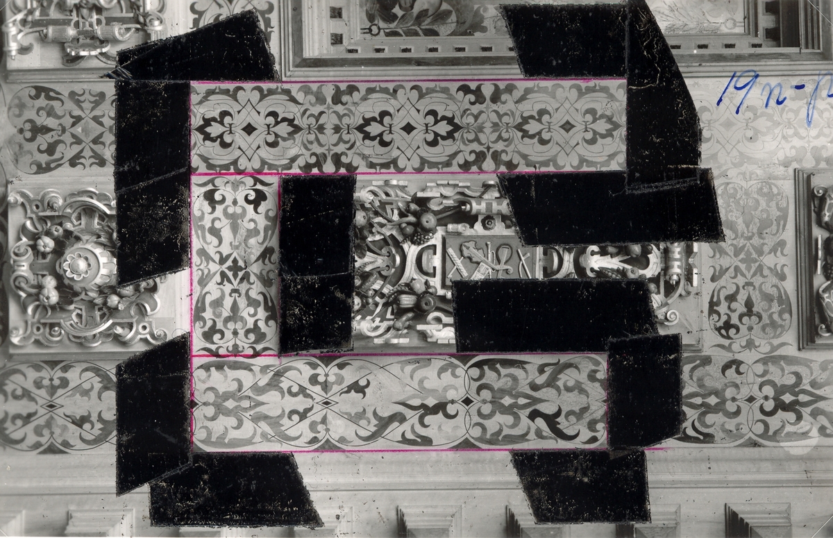 Kalmar slott. Kungsmakets kassettak med ramverkets tre olika moreskmönster i intarsia.