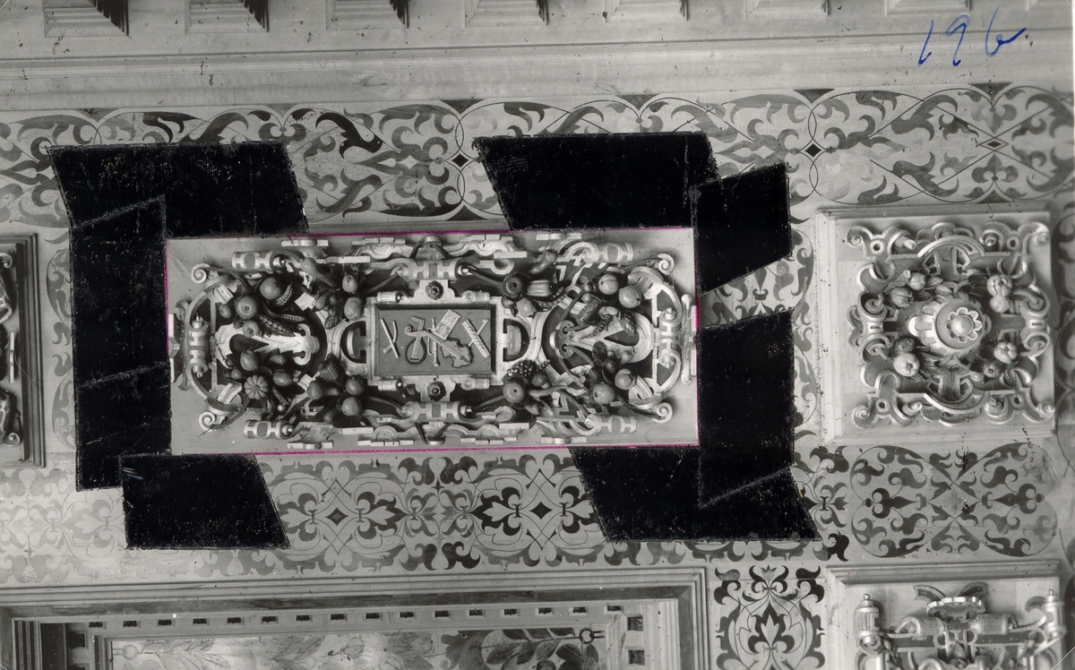 Kalmar slott. Kungsmakets kassettak med ramverkets tre olika moreskmönster i intarsia.