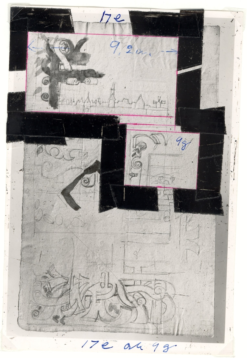 Kalmar slott. Kungsmakets kassettak med ramverkets tre olika moreskmönster i intarsia. Skisser av Nils Månsson Mandelgren 1848.