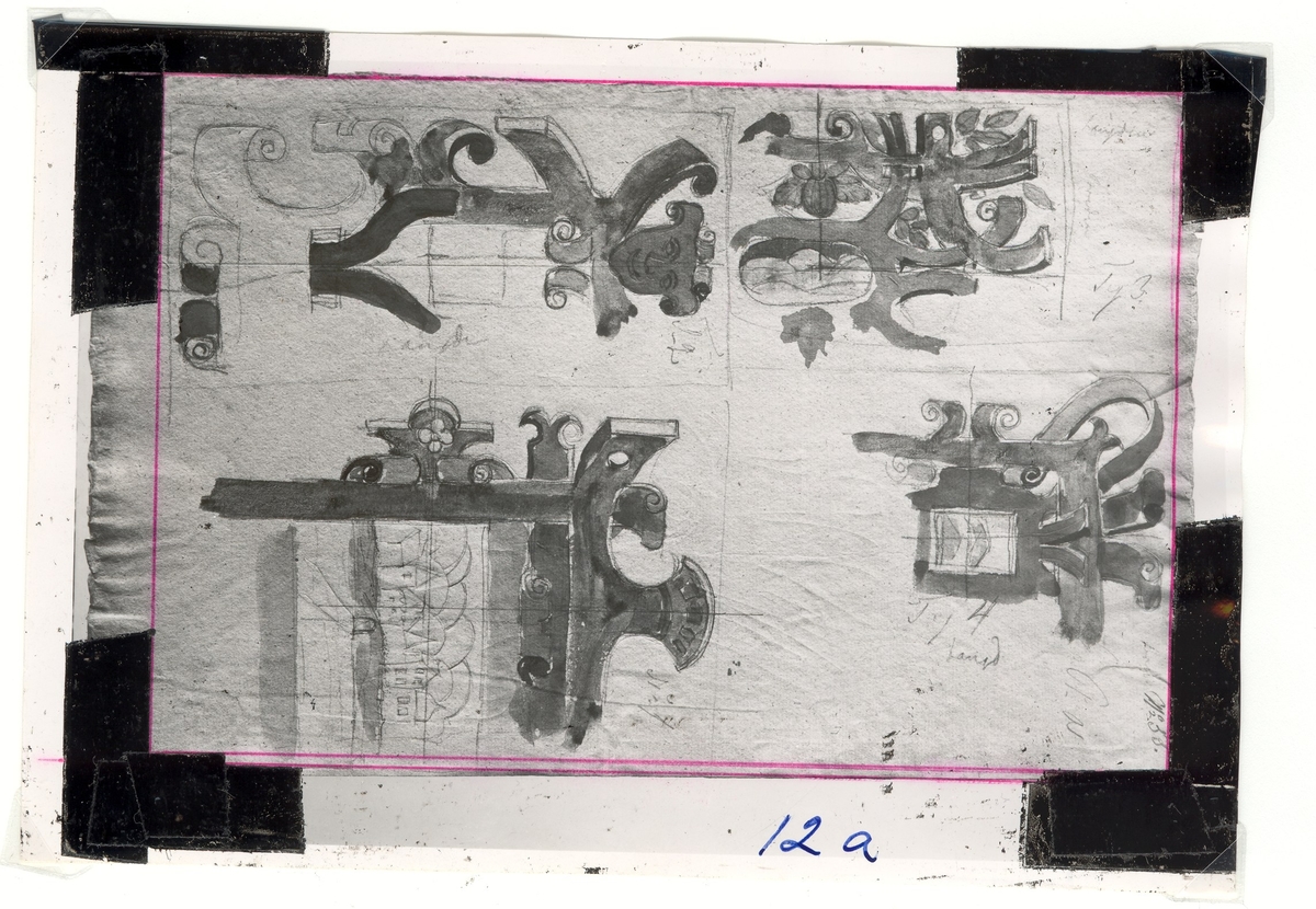 Kalmar slott. Detalj av Kungsmakets panel. Detaljskisser av Nils Månsson Mandelgren 1848. I övre raden från vänster fält 24 och 21. I undre raden fälten 12 och 20.