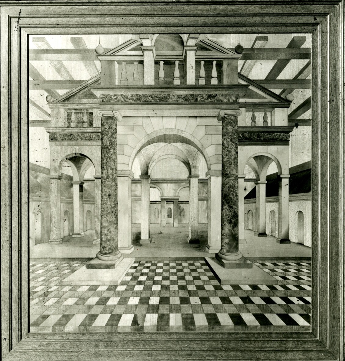 Kalmar slott: Kungsmakets dörr insidan övre del. Enligt Nils Månsson Mandelgren 1848. Intarsia.