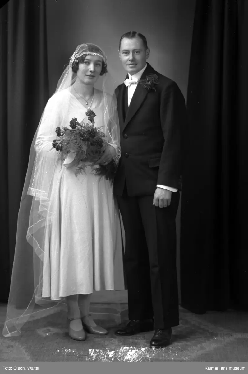 Bröllopsbild. Kvinnan har brudklänning och håller i en blombukett. Enligt Walter Olsons journal är bilden beställd av Erik Johansson.