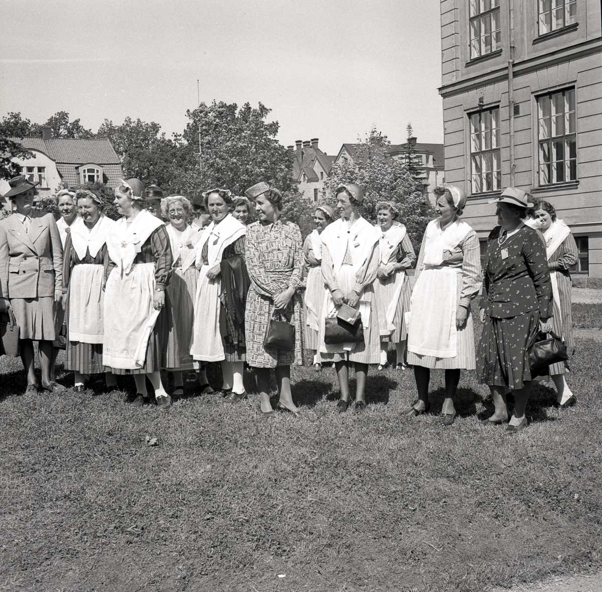 Ett antal kvinnor i husmorsdräkt, blandade med "civila", utanför